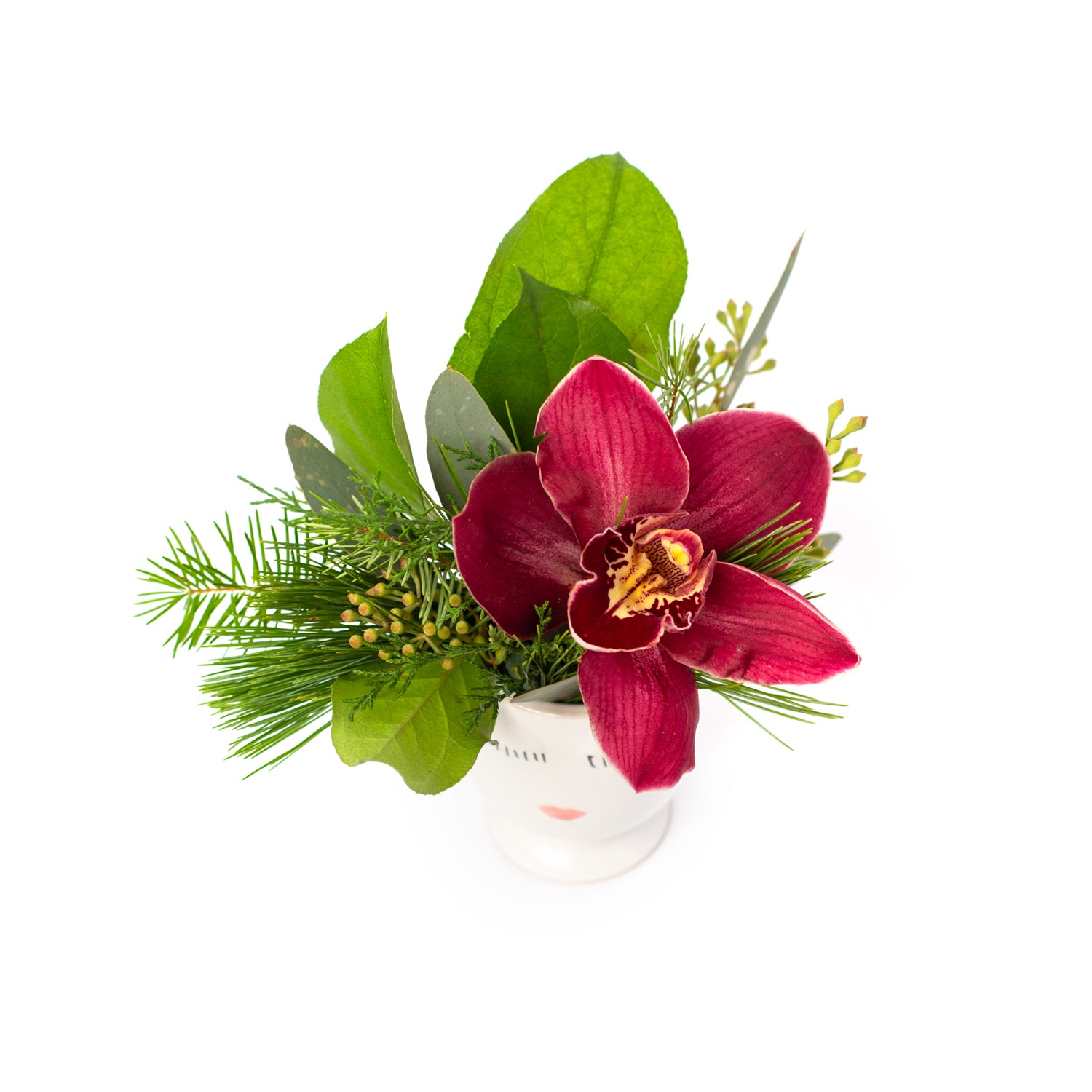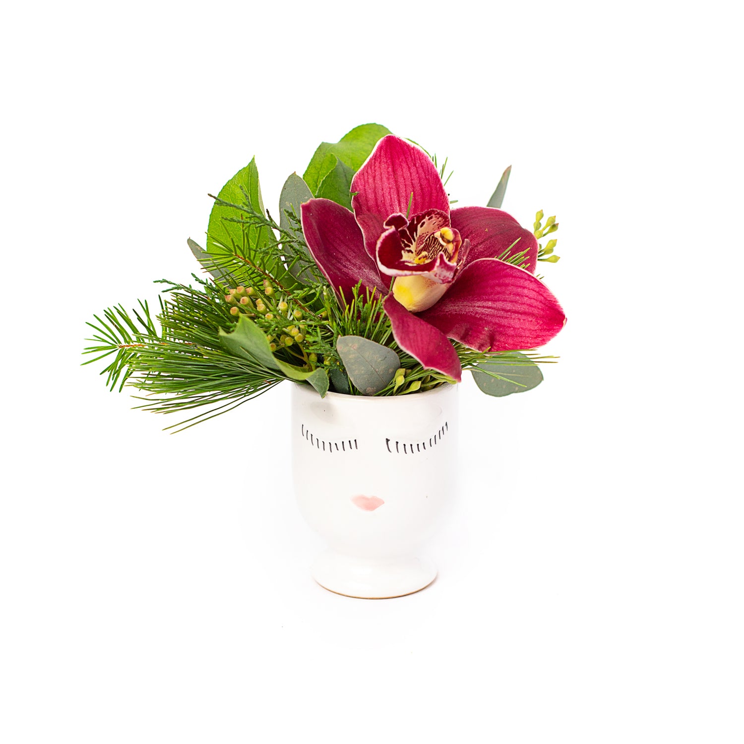 Our winter version of  Itty Bitty Biddy comes in our smallest face pot vase with a single blossom, filler and winter greens. This bitty arrangement will add a pop of positive warmth as a simple gift or the perfect teeny floral arrangement on your busy work desk.